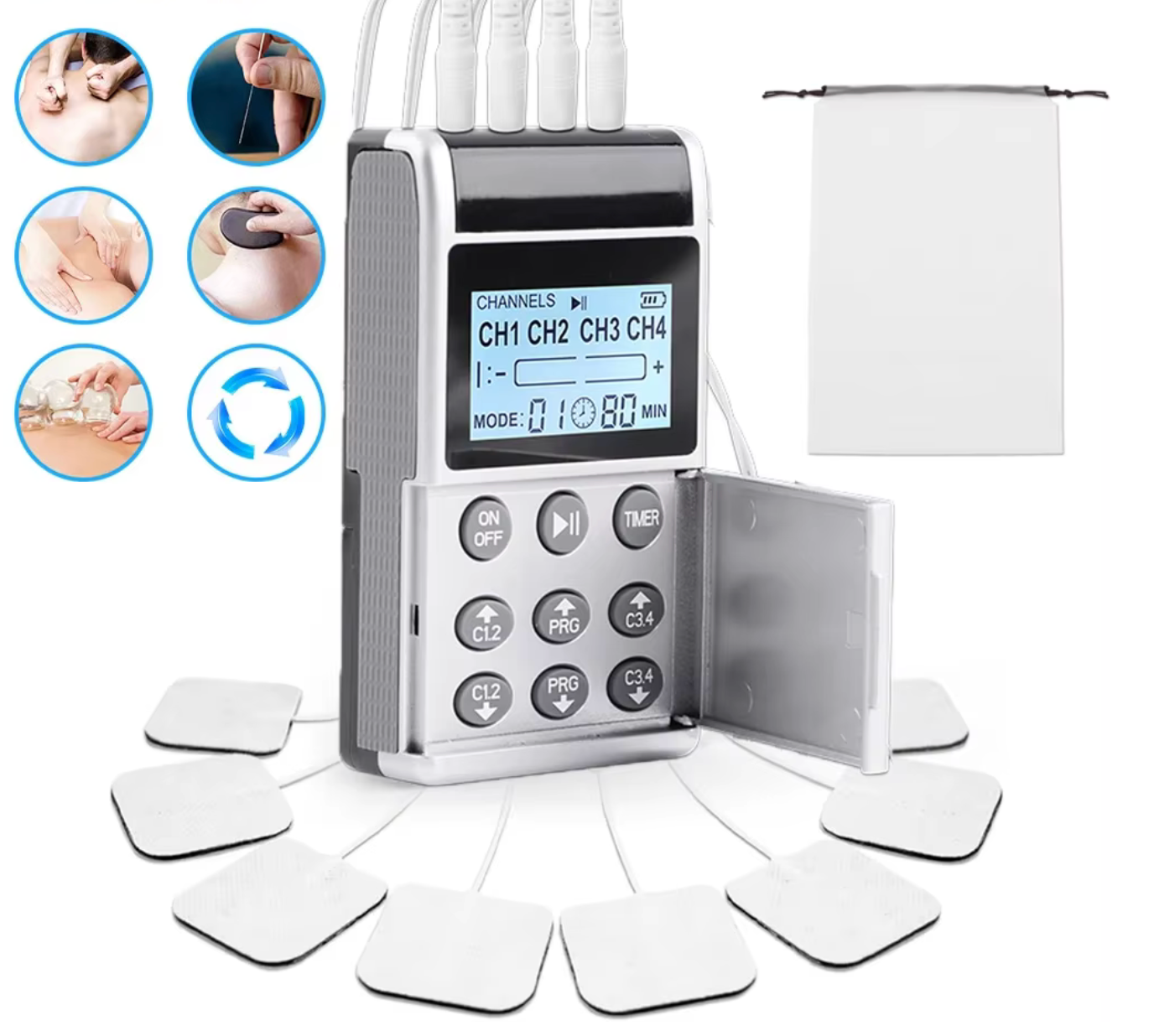 This portable TENS machine is designed to deliver effective pain relief anytime, anywhere. With 15 massage modes and 20 adjustable intensity levels, it allows users to personalize their therapy for maximum comfort and results. The four-output system enables simultaneous treatment of up to eight areas, making it ideal for relieving discomfort in the neck, shoulders, back, joints, and muscles. Featuring realistic massage simulations such as kneading, acupuncture, and cupping, along with skin-friendly hydrogel pads, a built-in timer, and long-lasting Type-C rechargeable battery, this device offers professional-level physiotherapy in a compact, easy-to-use design-perfect for home, office, or travel use.