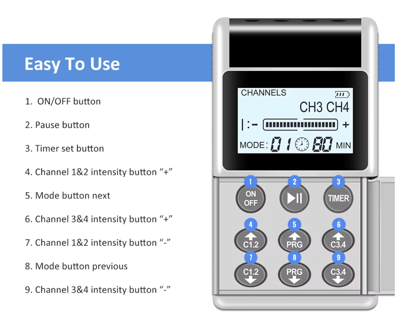 Expert note: Adjust the intensity to a comfortable level that does not cause pain or discomfort. Begin with the lowest setting and increase gradually as needed. If you experience sharp pain, excessive stimulation, dizziness, or skin irritation, stop using the device immediately. Avoid placing electrodes on broken skin, the front of the neck, eyes, chest/heart area, or head. Individuals with pacemakers, epilepsy, pregnancy, or serious medical conditions should consult a healthcare professional before use.