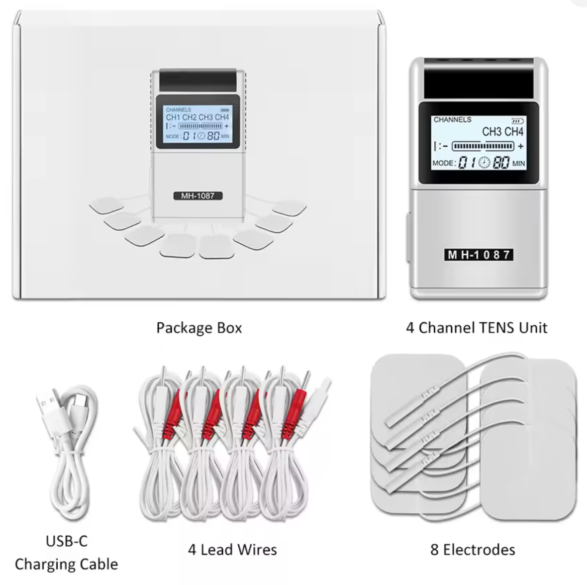 1 TENS machine, 1 Charging cable, 4 Lead wire, 8 Patch, 1 Instruction manual