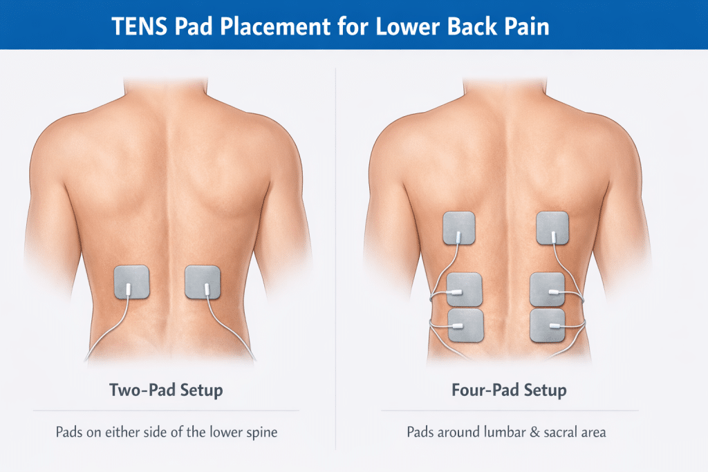 - Two-pad: Place one pad on each side of the painful lumbar region (paraspinal), about 1–2 inches lateral to the spine — do NOT place over the spine.